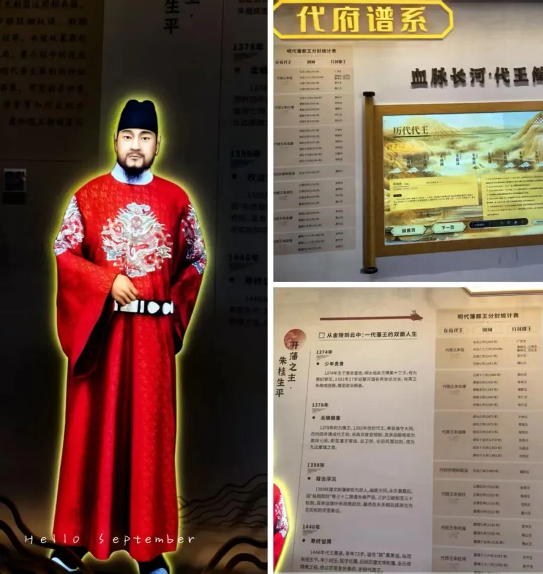 这里的一层有代王谱系图,由第一代代王朱珪,死后被谥号“简”,称为代简王,历经代隐王朱仕壥,代惠王朱成炼,代府宗理朱聪涓,代懿王朱俊杕,代昭王朱充燿,代恭王朱廷埼。到了朱廷埼,因没有亲子继承,后来虽有旁系继承爵位。就不算代王直接世系了。