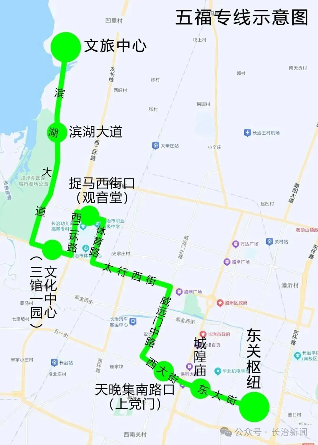 东关枢纽、商校巷东、商校巷西、潞阳门路口、市民政局、延安路口、城隍庙、长兴路口、十字街、天晚集南路口(上党门)、营口街、人民公园、附城东口、长治七中、妇儿医院、人民银行、昆仑巷口、太行南路口、西环路口、太西枢纽、体育路口、体育路南、体育路北(潞才社区)、捉马西街口(观音堂)、西二环捉马街口、文化中心(三馆一园)、漳泽湖湿地、泽馨苑北门、滨湖大道、漳泽湖湿地公园北门、神农湖大桥、文旅服务中心