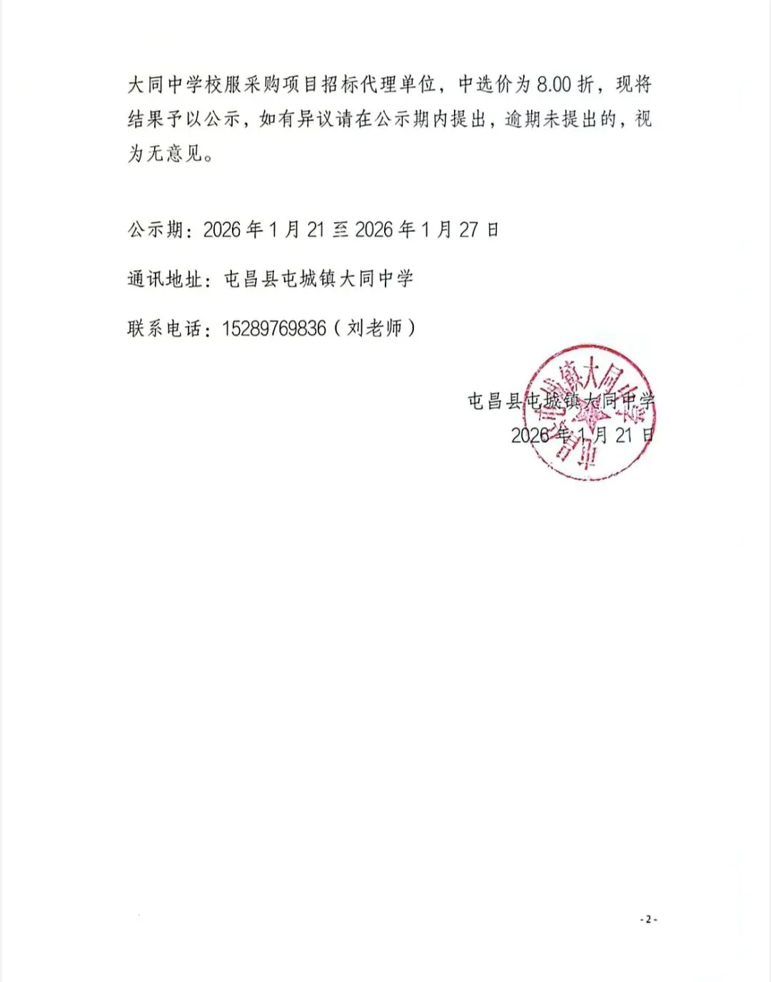 >屯昌县屯城镇大同中学关于公开选聘校服采购项目招标代理单位选聘结果的公示
