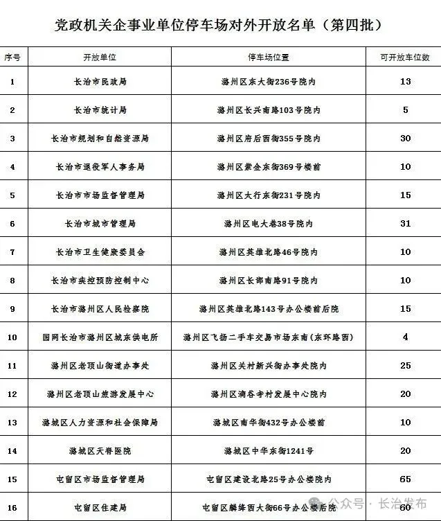 文明出行专项行动 | 长治市第四批16家党政机关企事业单位内部停车场错时免费对外开放