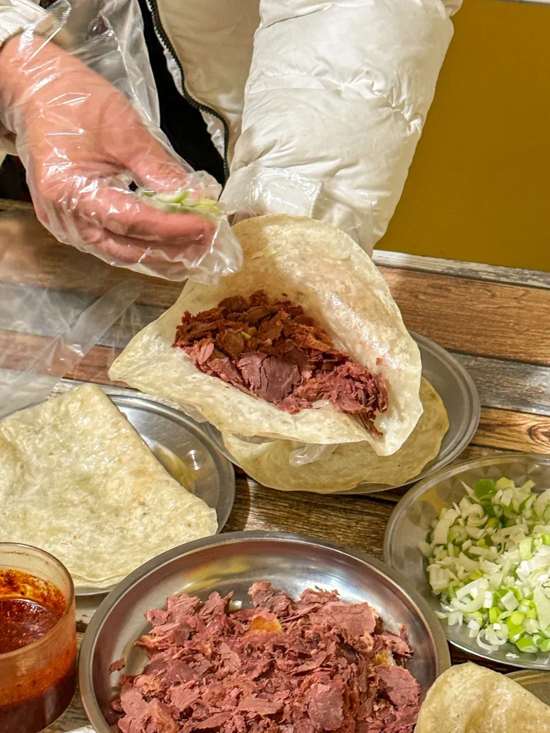 趁热卷上驴肉和葱花