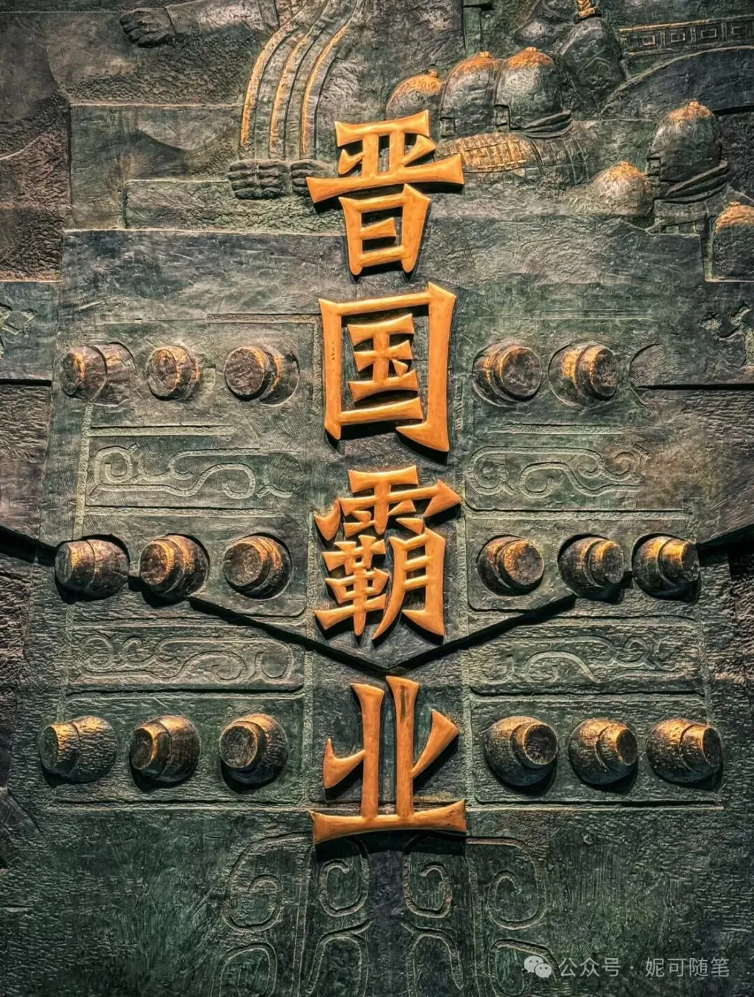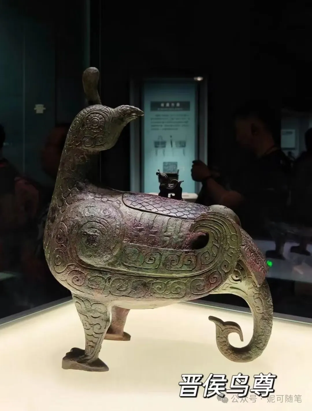 跟随讲解,从十大镇馆之宝开始了解山西省博物院,曾经被供奉于神圣威严的宗庙,寄托着一代诸侯依恋故土、藩屏周室的政治情怀,如今栖止于高雅的文明圣殿,以一双明目看尽三晋历史跌宕的西周祭祀礼器晋侯鸟尊,是最能代表山西的文物,在晋博院稳居C位,也是禁止出国的国宝级文物。初看是只昂首挺立的凤鸟,细看大鸟回眸小鸟仰望,两只鸟对视凝望了3000年。身上披满绚丽的羽纹、雷纹和羽翎纹,两翅和双足饰为卷云纹,尾部还有一只大象,象目炯炯,象鼻内卷,与凤鸟的双足构成稳定的三角支撑,而凤鸟的双翅又恰恰构成大象的耳朵。正面看是一只鸟尊,背面看又像一个象尊。“晋”从何来?鸟尊的器盖内侧及内腹部均铸有相同的两行九字铭文“晋侯作向太室宝尊彝”,这里的晋侯指的是第一任晋侯燮父,他把唐国更名为晋国。这个“晋”字是迄今为止考古出最早的金文“晋”字,见证了燮父改唐为晋的历史。