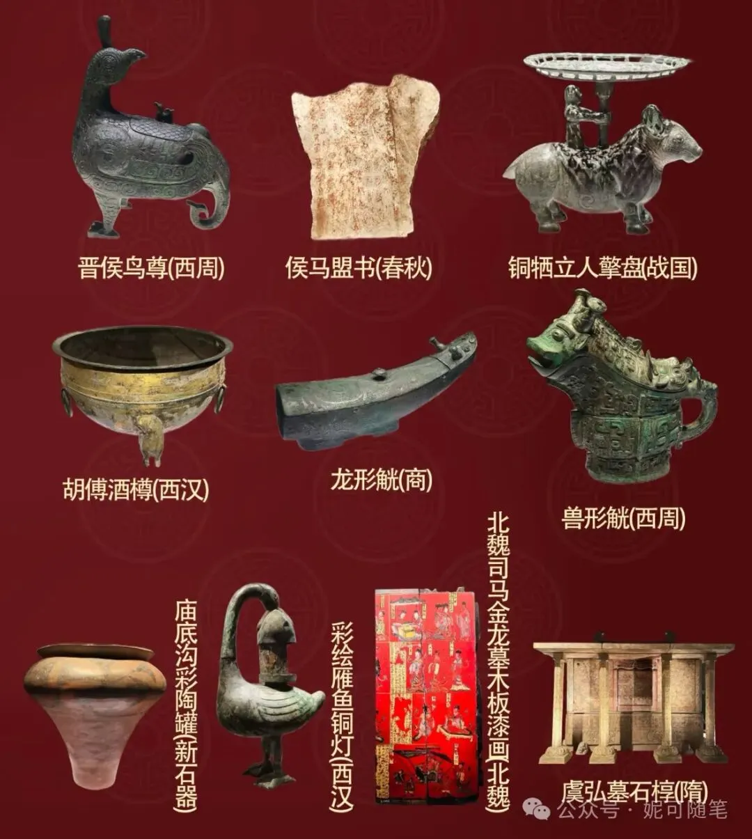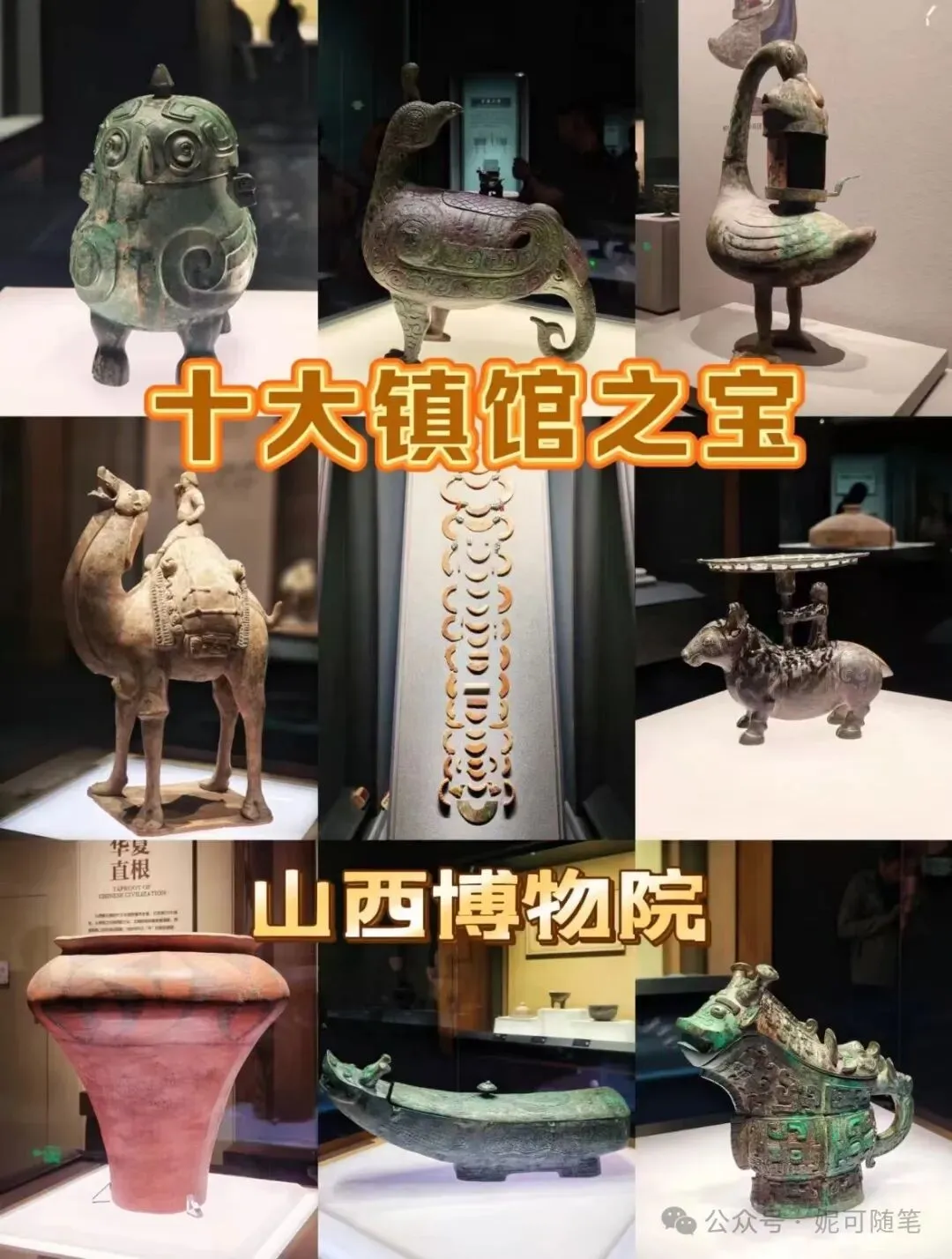 商代兽型觥造型别致,采用三层花纹,青铜纹饰精细,是3000多年前商代工匠的神来之笔。龙形觥通体呈龙形,两侧有鼍纹,扬子鳄的造型在青铜器中独一无二。这两件觥是“觥筹交错”里所讲的的盛酒器,而筹是行酒令的筹码,古代贵族在这精美的器具里宴饮沉醉。春秋时期的侯马盟书,是晋国世卿赵鞅同卿大夫间举行盟誓的约信文书。仰韶文化时期的庙底沟彩陶罐,这件器物仰韶故里人眼熟能详,体型硕大,完整无缺,上面图腾象征玫瑰花,考古命名为“西阴之花”,是山西目前发现的最大的彩陶罐。西周晋侯苏编钟在晋博保存2件,另外14件保存于上海博物馆。双音编钟技术让音乐更加丰富,钟体结构赋予了极为宽广的音域,在音乐史上享有重要地位。上面铭文不仅记录了晋侯苏的征战经历,还包括7个独特的历日记载,这在西周金文中极为罕见,是研究西周历史的重要依据。这组西周晋侯夫人玉组佩共204件玉器,是迄今发现数量最多、全中国等级最高的玉组佩,真正的顶奢,也是禁止出国展出文物。西汉胡傅酒樽温酒器,重达6000克,通体鎏金加彩绘,纹饰华美,技法十分罕见,器身有虎、象、鹿、马等动物,图案是汉代流行的博山式林野神兽逐戏场面,布局灵动,是草原文化与中原典雅融合的典范。主人胡傅生前是雁门郡都尉,昭君出塞后兵戈停歇,有了这超大酒樽,守边的胡傅终于可以和将士们通宵夜饮,共同庆贺家园来之不易的和平昌宁,一幅塞外欢欣的欢庆画面。西汉雁鱼铜灯,雁颈修长,雁体肥硕,回首衔鱼,构思巧妙,油灯燃烧的烟气通过鱼腹和雁颈导入雁腹,雁腹内盛水,起到净化空气的作用。隋代虞弘墓石椁是十大考古新发现,墓主人虞弘身世传奇,是位外国友人。这是第一座经过科学发掘,有准确纪年、并有着完整丰富中亚图像资料的墓葬,为研究北朝至隋代中西文化交流提供了重要依据。
