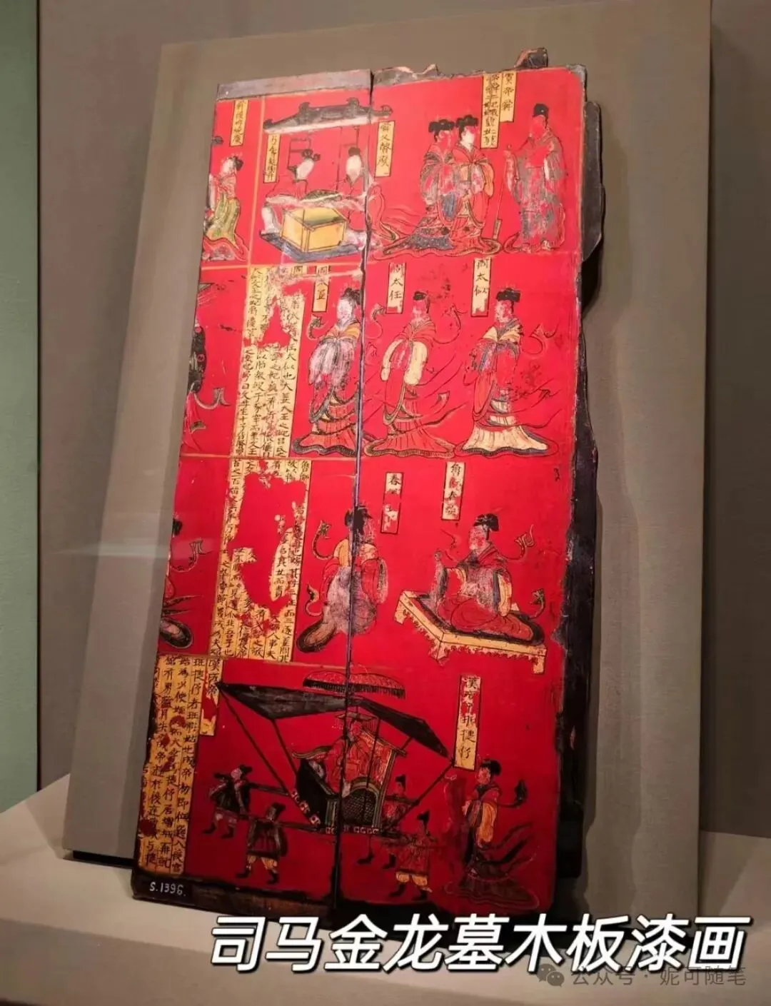 除了这些镇馆之宝外,晋公盘(2600年前的嫁妆天花板,晋文公重耳为长女孟姬出嫁楚国所铸的媵器)、鸮卣(商代晚期青铜酒器,晋博网红文物,因萌被称为古代版“愤怒的小鸟”)、司马金龙墓木板漆画屏风(榫卯连接、木胎髹朱漆,所绘漆画为彩绘列女古贤人物故事,题记和榜书文字介于隶楷之间,气势疏朗,是少见的北魏墨迹)、铜牺立人擘盘、龙纹陶盘、北齐徐显秀墓石门等,不胜枚举,也都是珍品,精美绝伦。