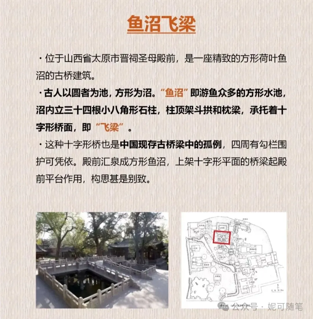 晋祠三宝,宋代原装木结构建筑代表圣母殿,建于北宋984年,是我国现存宋代建筑中保存最完整的国宝级建筑之一,为唐叔虞母亲而建。其重檐歇山顶和前檐柱上的雕盘龙都是中国古建筑的珍贵实例,殿前8根木雕盘龙柱,两边对称的分别是蟠龙、应龙、蛟龙和螭龙,殿内供圣母邑姜像。邑姜是姜子牙女儿,周武王姬发夫人,故四周环列共有43尊宋代彩塑,正门上所悬浅蓝背景色的大匾为宋真宗真笔。献殿建于金代,是中国唯一的一座殿和亭结合的献殿。纯木质卯榫结构独一无二,是专门给圣母邑姜供奉祭品的地方。无门墙,栅栏围合,像凉亭,又似天然冰箱。俗语说“墙倒屋不塌”,木结构承重坚固耐久,献殿实为佐证。四通八达的鱼沼飞梁,是一座举世罕见的十字形古桥,建于北魏之前,1500年以上历史,它的独特结构和造型都体现了古代桥梁建筑的高超技艺。建筑大师梁思成给予了很高的评价“此式石柱桥,在古画中偶见,实物则仅此一孤例,洵为可贵。”