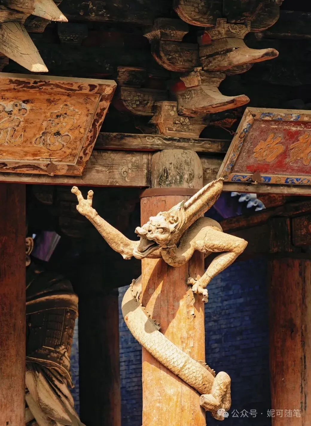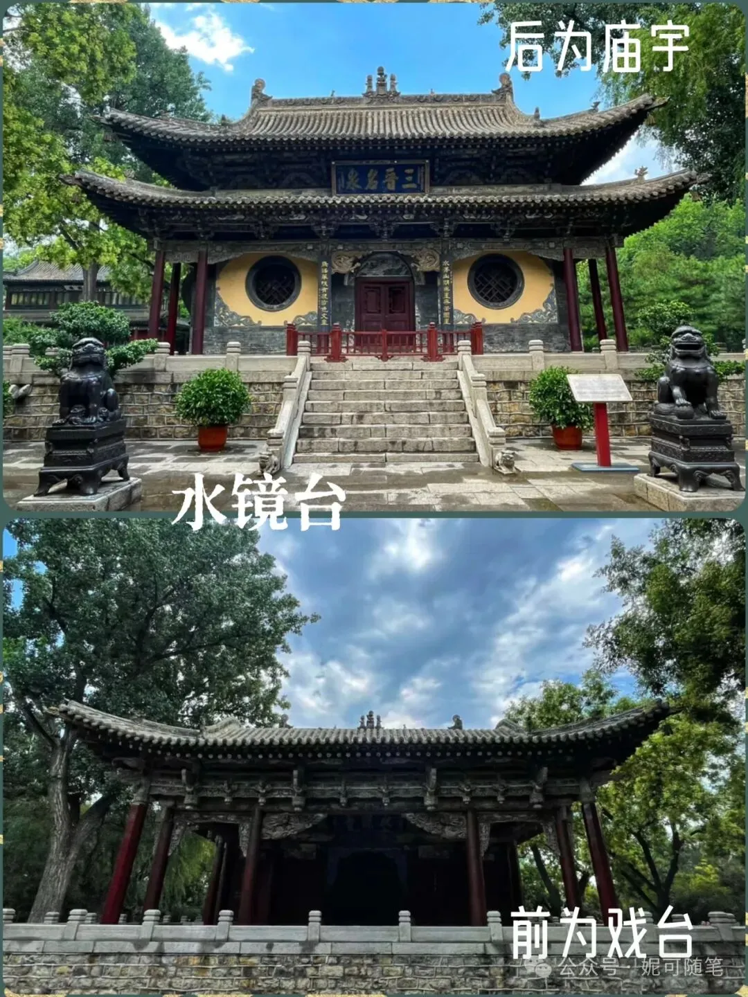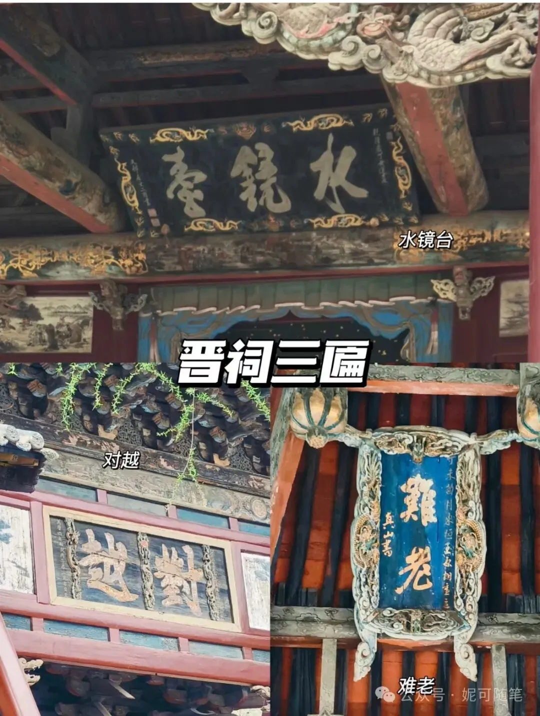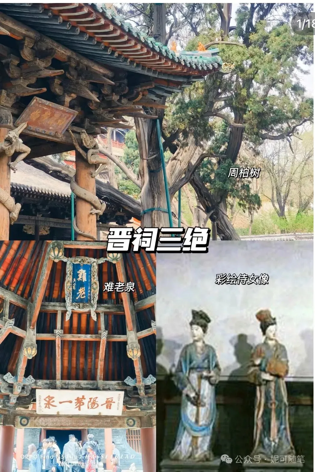 晋祠三绝,圣母殿内宋朝彩塑仕女像,是宋代宫廷生活的真实写照,是中国古代泥塑艺术珍品。每尊彩塑排列有序,站姿优美,形态各异。表情生动逼真,眼神、身姿、手势乃至微笑都显得是那样的流畅自然,甚至能从细微的表情中感受到她们那一刻的心情。晋祠里的周柏,“地灵草木得余润,郁郁古柏含苍烟”,为周初所植,距今已三千多年了。一棵树身向南倾斜,龙蟠虬屈,形似卧龙,俗称“卧龙柏”,另一株名为“长龄柏”,两株相伴相依,阅尽晋阳沧桑。难老泉相传是晋水源头,常年恒温17度,清澈见底,即使在隆冬时节,泉水底部的水草也碧绿如茵。难老泉的历史甚至可以追溯到尧舜时期,自古以来许多历史名人都曾在此逗留观光且留下诗词文章,当之无愧的被称作“晋阳第一泉”。据导游讲前几十年挖煤导致泉水断流,上个月才复流,这个隆冬恰好遇到,希望乙巳蛇年好运。 晋祠三匾,水镜台是供晋祠中的主建筑圣母殿中的圣母娘娘邑姜看戏用的戏台,集中体现了中国古代建筑殿、台、楼、阁四种风格,前部为单檐卷棚顶,后部为重檐歇山顶,下埋八口水缸,有扩大声音之用。从建筑形制上分前后两部,前为戏台,后为演员妆造换装之地,后台是明朝所建,前台是清朝补建,虽兴建于不同时期,但建筑却很完美地融合在一。“水镜”取自《汉书》名句“清水明镜不可以形逃”,寓为人世间的善恶忠奸尽人皆知。水镜台匾是悬挂在古戏台“水镜台”正额上的牌匾,由清乾隆翰林、名书法家、太原县晋祠人杨二酉清代乾隆二十二年所题,被誉为“秀丽之笔”,尽显文人儒雅。后台还是86版西游记悟空大战二郎神所变小庙宇原型,可否眼熟?对越匾位于晋祠中轴线对越坊上,该坊建于明万历四年(1576年),相传明代大书法家高应元母亲头痛久病不愈,在吕祖阁求得“添砖加瓦”偈语。高应元发现晋祠内殿堂楼阁亭台桥榭一应俱全,独缺牌坊,于是便出资修建对越坊,并亲自手书对越匾。出自《诗经·周颂·清庙》中的“对越在天”,“对”为报答,“越”为颂扬,意为报答宣扬祖先的高尚功德。难老匾位于晋祠圣母殿一侧难老泉亭上,“难老”二字出自《诗经》“永锡难老”,意为生生不息,青春永驻,此匾由明末清初著名思想家、文学家傅山雍正五年所书。 晋祠的美,在灵动的溪水,在无声的建筑,在亭台楼榭的秀美。晋祠及山西古建的美,凝聚古人的哲思与审美,展现不同历史时期的风采。今日望着晋祠一座座精美古建,就仿佛隔着时空一次次与梁林及营造学社同仁们所发现的古建华章相遇,仿若一次次穿越春秋战国、隋唐五代、辽宋金元,也体验着他们如何在考察行程中克服交通和食宿的困难,以及面临生死的战火考验……