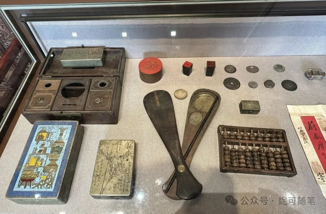 在这里,可以看到形制各异的计量工具,精心打磨的算盘,大小不一的镖箱,沉甸甸的账本,安静地诉说着那个“嗡嗡作响”的时代……