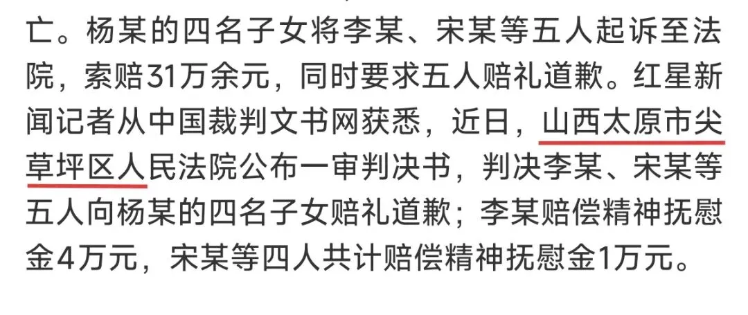山西太原市尖草坪区人民法院公布一审判决书,判决李某、宋某等五人向杨某的四名子女赔礼道歉;李某赔偿精神抚慰金4万元,宋某等四人共计赔偿精神抚慰金1万元。本案中,原告不能提供证据证明其父亲杨某的死亡与各被告的行为之间有因果关系,故原告要求各被告支付死亡赔偿金、丧葬费、交通费,没有法律依据,法院不予支持。李某未在第一时间拨打急救电话,没有对杨某进行积极正确的救助,其行为违反公序良俗,给四原告造成精神伤害,应给四原告赔礼道歉并赔偿相应的精神损失费。