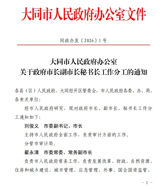 经市人民政府研究,现对政府市长、副市长、秘书长工作分工通知如下: