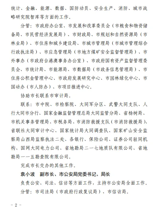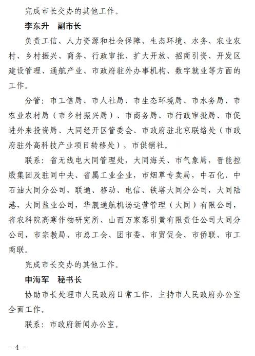 分管:市工信局、市人社局、市生态环境局、市水务局、市农业农村局(市乡村振兴局)、市商务局、市行政审批局、市促进外来投资局、大同经开区管委会、市政府驻北京联络处(市政府驻外高科技产业项目转移处),市供销社。