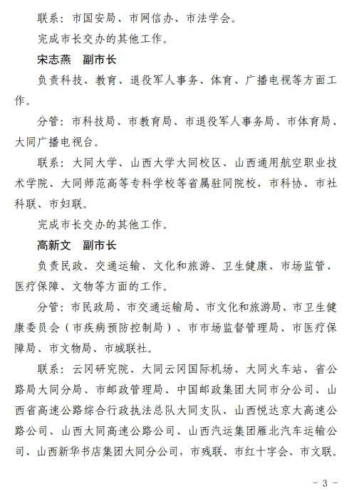 分管:市科技局、市教育局、市退役军人事务局、市体育局、大同广播电视台。