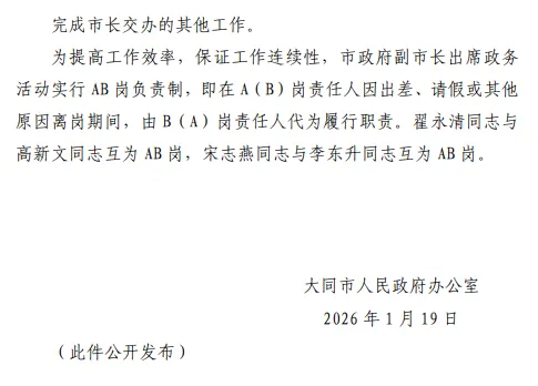 为提高工作效率,保证工作连续性,市政府副市长出席政务活动实行AB岗负责制,即在A(B)岗责任人因出差、请假或其他原因离岗期间,由B(A)岗责任人代为履行职责。翟永清同志与高新文同志互为AB岗,宋志燕同志与李东升同志互为AB岗。