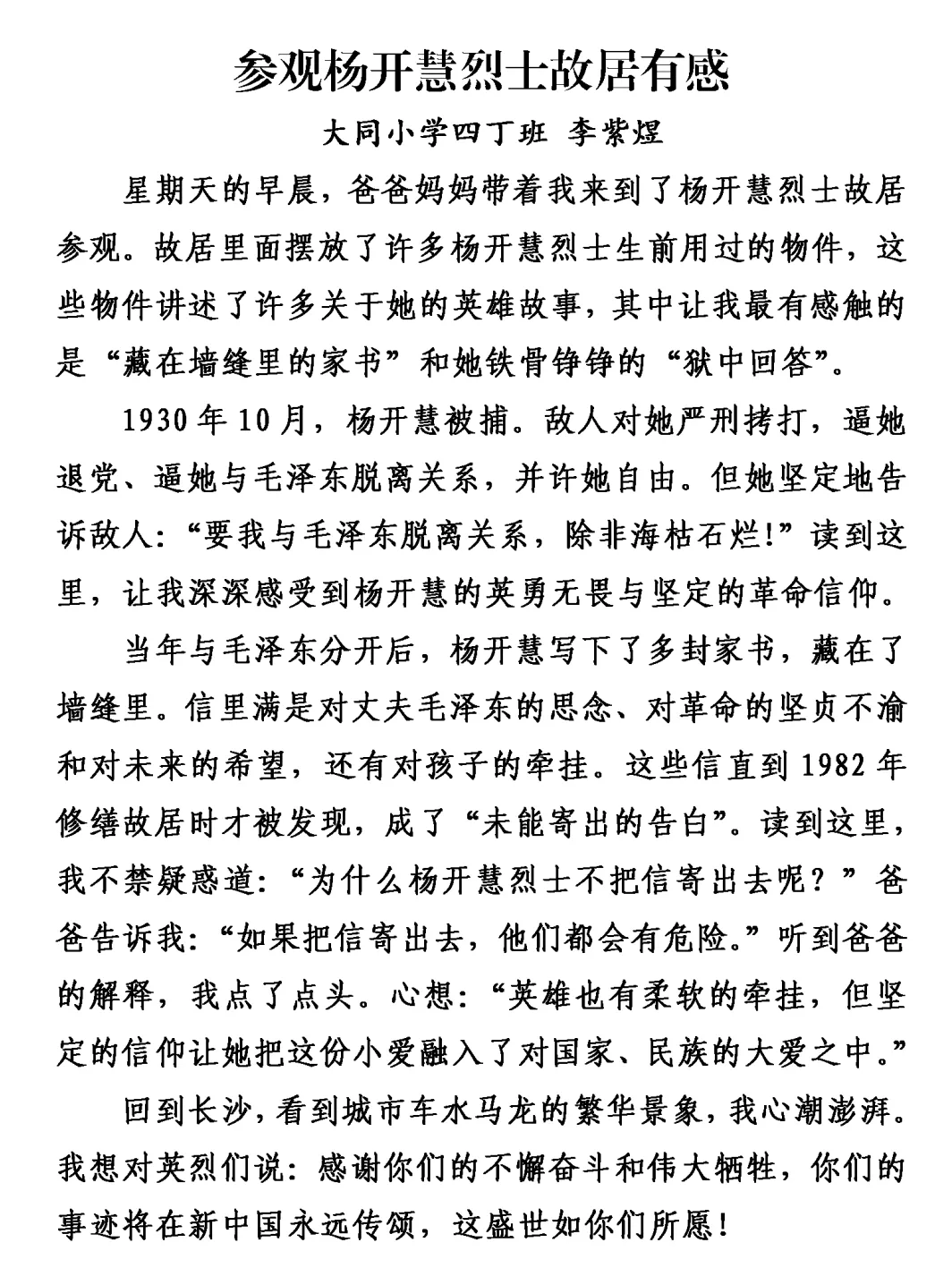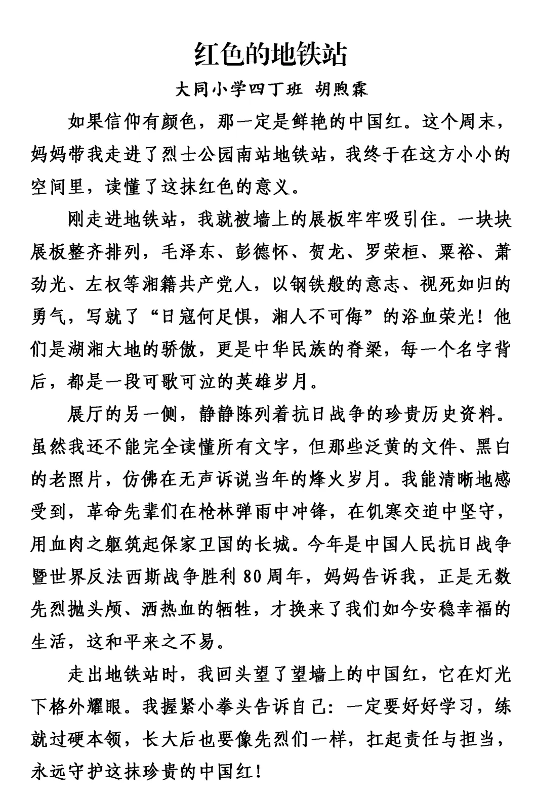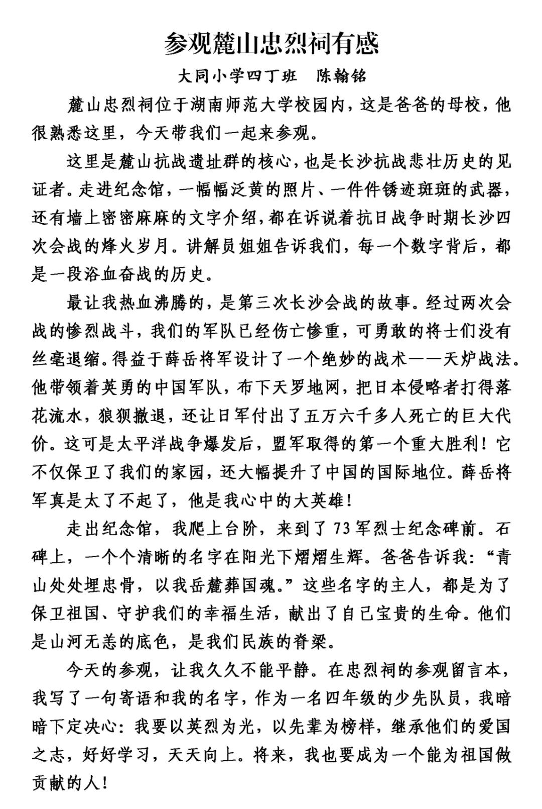 这个冬天,大同小学四丁班的同学们背起书包,拿起纸笔,走出教室,踏上了一趟特别的“写作湖南”之旅。这不仅仅是一次写作练习,更是一次与历史对话、与英烈相逢的心灵旅程。从麓山忠烈祠的肃穆宁静,到杨开慧故居的木窗旧桌;从湖南省烈士公园南门这个“红色地铁站”,到湖南大学旁沉默诉说着抗战岁月的炮弹坑洼——孩子们用脚步丈量三湘热土,用眼睛记录红色印记,用稚嫩却真挚的笔触,写下跨越时空的感动。他们站在夏明翰“砍头不要紧”的慷慨前凝思,在谭嗣同“我自横刀向天笑”的壮烈中驻足,在缪伯英纪念馆里寻找中国第一位女共产党员的坚定身影;他们的镜头里,有长沙市党史馆的岁月回响,有湖南省烈士公园的不朽丰碑。每一段视频,每一篇习作,都是孩子们与湖南这片英雄土地的一次深情拥抱,是红色基因在新时代少年心中落地生根、拔节生长的生命过程。