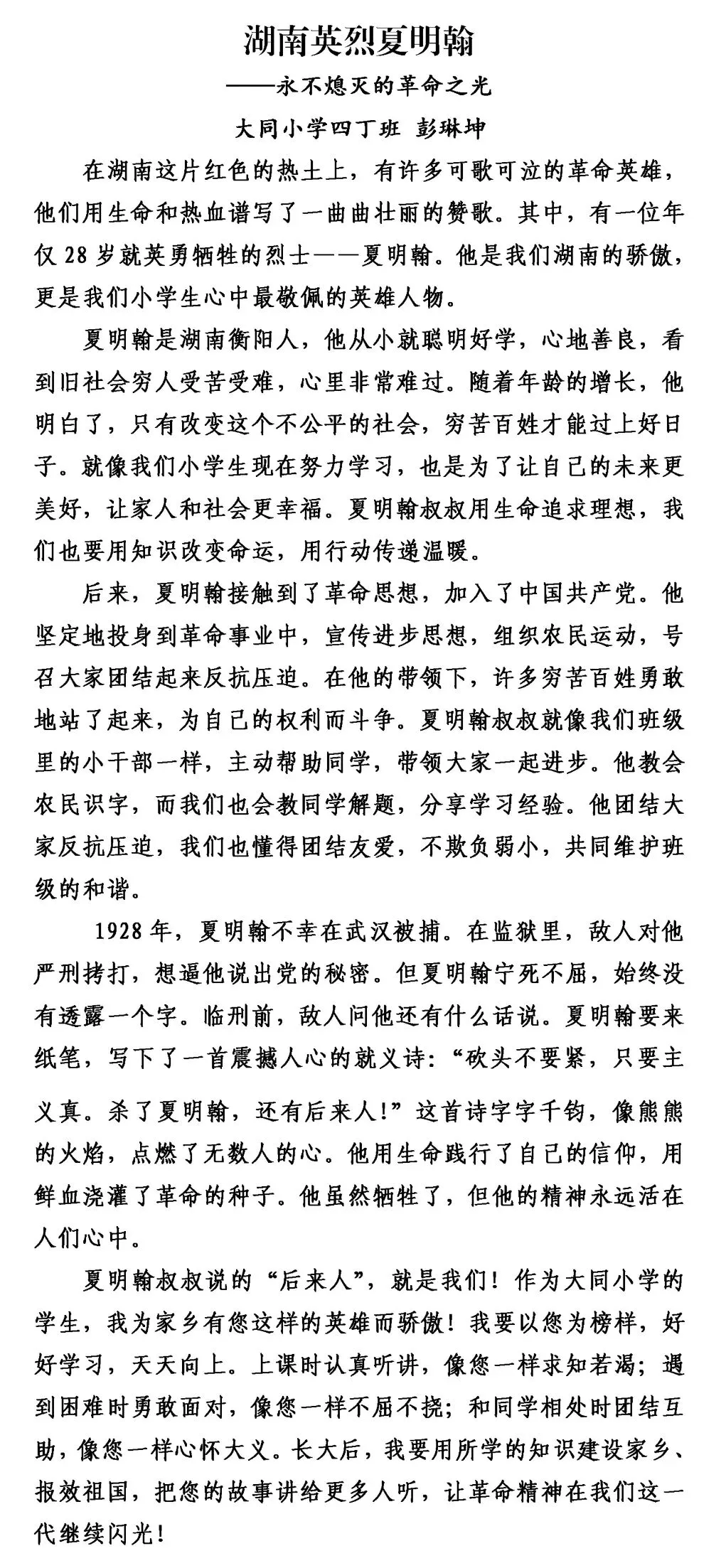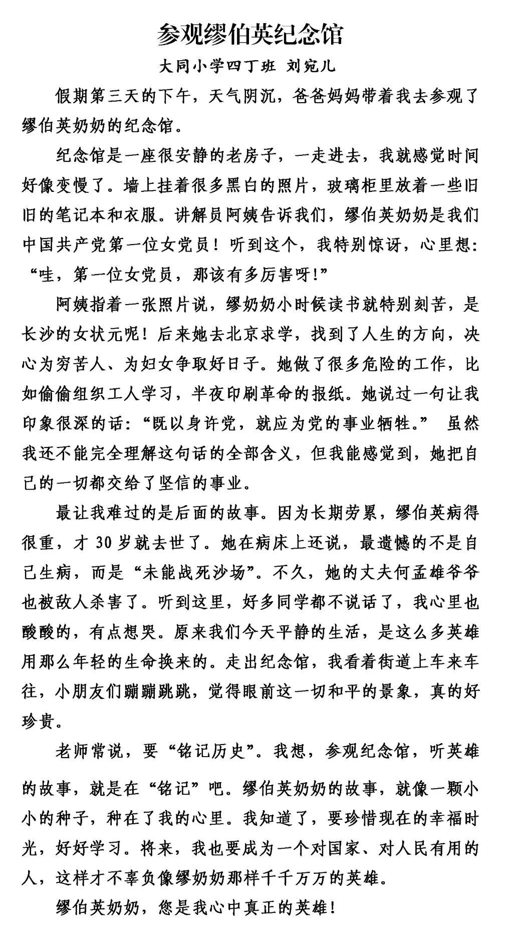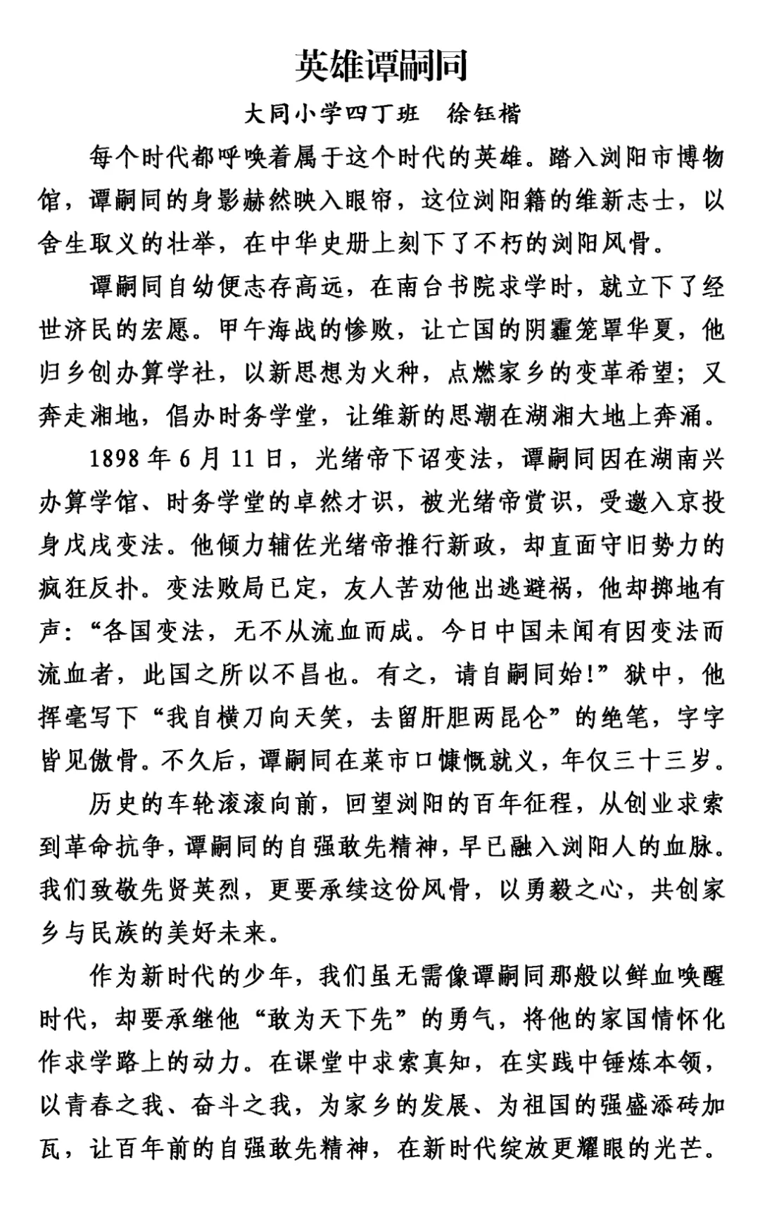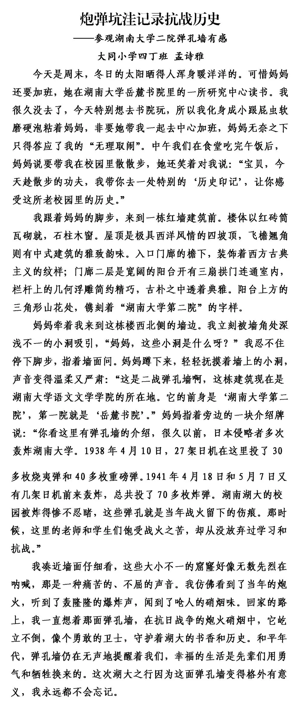这个冬天,大同小学四丁班的同学们背起书包,拿起纸笔,走出教室,踏上了一趟特别的“写作湖南”之旅。这不仅仅是一次写作练习,更是一次与历史对话、与英烈相逢的心灵旅程。从麓山忠烈祠的肃穆宁静,到杨开慧故居的木窗旧桌;从湖南省烈士公园南门这个“红色地铁站”,到湖南大学旁沉默诉说着抗战岁月的炮弹坑洼——孩子们用脚步丈量三湘热土,用眼睛记录红色印记,用稚嫩却真挚的笔触,写下跨越时空的感动。他们站在夏明翰“砍头不要紧”的慷慨前凝思,在谭嗣同“我自横刀向天笑”的壮烈中驻足,在缪伯英纪念馆里寻找中国第一位女共产党员的坚定身影;他们的镜头里,有长沙市党史馆的岁月回响,有湖南省烈士公园的不朽丰碑。每一段视频,每一篇习作,都是孩子们与湖南这片英雄土地的一次深情拥抱,是红色基因在新时代少年心中落地生根、拔节生长的生命过程。