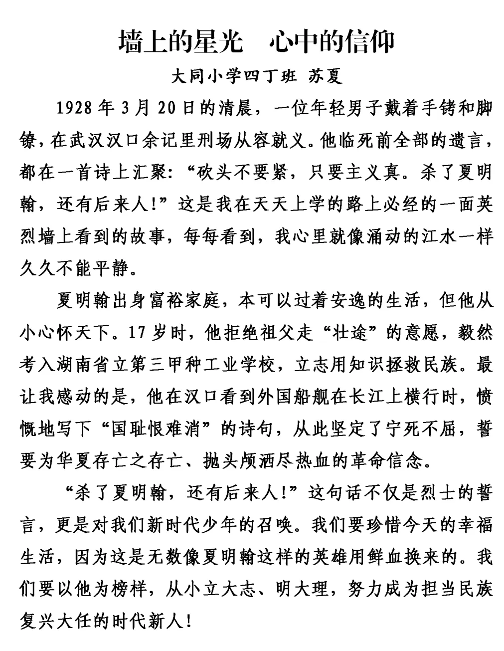 当我们翻阅这一篇篇带着温度的文字,观看那一帧帧充满敬意的画面,我们看到的不仅是历史的再现,更是未来的生长。四丁班的同学们用笔尖与镜头完成了一次特殊的“采访”——采访历史,采访精神,采访深植于湖湘大地的那份忠诚与担当。或许,孩子们还不能完全理解那个年代的烽火连天,但他们记住了那份“只要主义真”的坚定;或许,他们尚未彻底明白何谓“敢为天下先”,但他们触摸到了那份“虽千万人吾往矣”的勇气。这一次行走与书写,已在他们的心中种下了家国的种子、精神的坐标。让我们透过这些真挚的作品,跟随孩子们的视角,再一次走进湖南的红色记忆,感受那份永不褪色的赤诚。愿这份采写,能够点亮更多心灵;愿这些来自历史的回响,能在新一代的笔尖下,继续传唱、永远鲜活。