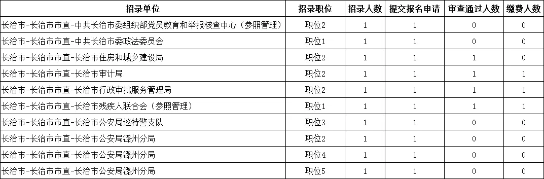 截至1月21日16:30,山西省考长治地区男生岗选调人数30人,提交报名申请人数225人,审查通过136人,缴费人数70人;山西省长治地区女生岗选调人数30人,提交报名申请人数273人,审查通过163人,缴费人数72人。