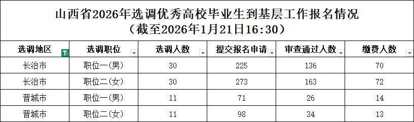 山西省2026年选调优秀高校毕业生到基层工作报名情况(截至2026年1月21日16点30) ![]() |
