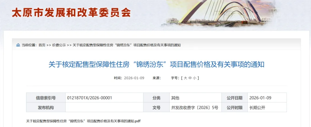 按照《山西省发展和改革委员会关于印发<山西省定价目录)的通知>(晋发改规发(2022)2号)、《太原市人民政府关于印发太原市高质量规划建设保障性住房实施方案的通知》(并政发(2024)6号)《太原市人民政府办公室关于印发太原市保障性住房配售管理办法的通知》(并政办发(2025)9号)有关规定经市政府同意,现将配售型保障性住房“锦绣汾东”项目配售价格及有关事项通知如下: