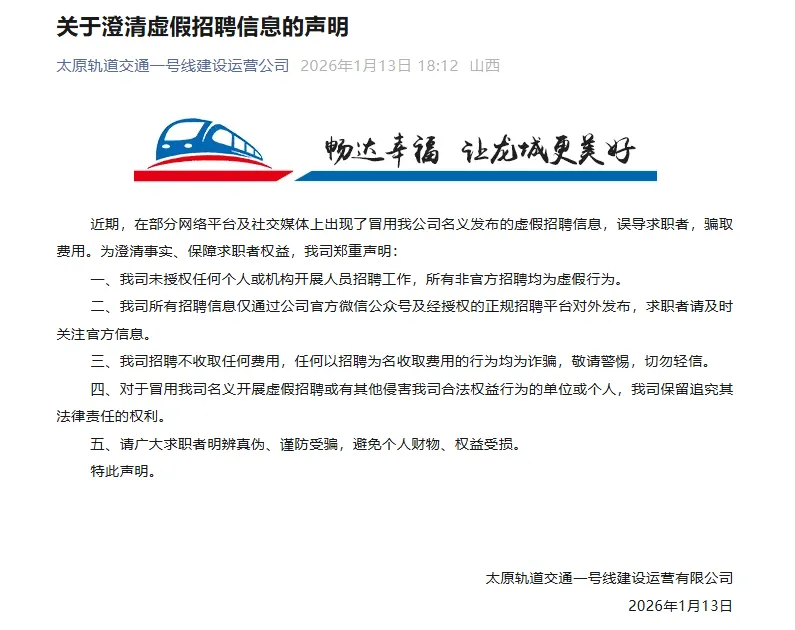 近日,在部分网络平台及社交媒体上,出现冒用太原轨道交通一号线建设运营有限公司名义发布虚假招聘信息,误导求职者,骗取费用。该公司发布《关于澄清虚假招聘信息的声明》,以澄清事实、保障求职者权益。