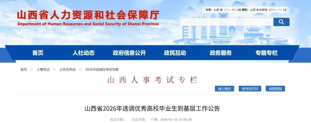 符合报名条件的高校应届毕业生于2026年1月20日9:00至1月26日24:00期间登录山西人事考试专栏提交报名申请。