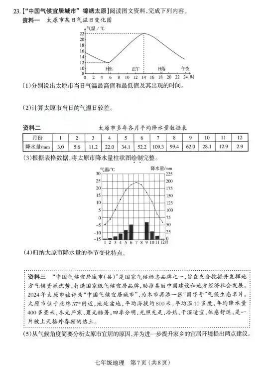 (5)原因:太原市位于北纬37°附近,地处北温带:属于温带季风气候:年均温10多度,年均降水量400多毫米,冷热、干湿适宜:四季分明,光照充足:冬无严寒、夏无酷暑等。(每点1分,任答两点得2分)