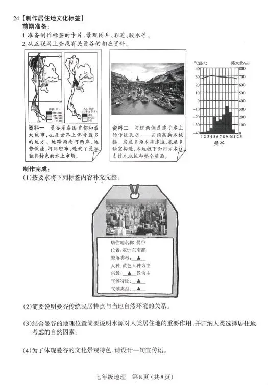 (3)重要作用:提供生产生活用水:提供丰富的水产品:提供便利的航运条件;促进水循环,维持生态平衡:风景优美,利于发展旅游业等。(每点1分,任答三点得3分)自然因素:气温:降水:水源:地形:海洋等。(每点1分,任答两点得2分)(4)曼谷是世界上佛寺最多的地方:有独具特色的水上市场:传统民居是尖顶高脚木板楼:拥有优美的热带风光等。(任答一点得2分)