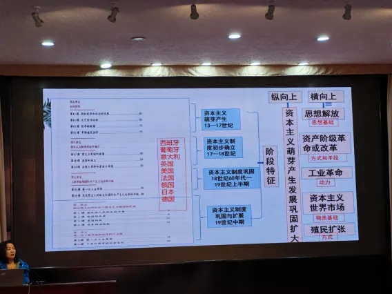 在“教材为基 建构体系”板块,周老师着重厘清教材与课标的内在关联,强调教材是连接课标与教学实践的重要桥梁,是课标要求的具体体现与细化,二者密不可分。基于此,她提出用好教材的三大实践策略:一是深入研读教材,逐句分析文本、史料与思考题,精准把握教学重难点;二是巧用教材资源,挖掘文献、图片等素材,丰富课堂教学活动;三是引导学生自主研读教材,培养自主学习与梳理知识的能力。为强化实操性,她以九年级上册第五单元至下册第二单元内容为案例,示范如何整合教材、搭建知识框架——纵向上梳理资本主义萌芽产生与发展的完整脉络,横向上从思想解放、资产阶级革命与改革、工业革命、资本主义世界市场形成、殖民扩张等多维度拓展,同时兼顾不同国家的发展路径,引导教师以框架化思维帮助学生系统掌握知识。