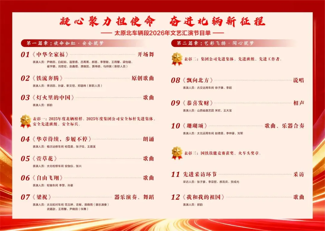 在文艺汇演中同步对国铁集团技能竞赛获奖者、“火车头”奖章获得者、集团公司2025年度安全标杆车间、安全标杆班组、安全标兵、集团公司2025年度先进集体、先进班组、先进生产工作者以及2025年度“北辆榜样”进行了表彰。
