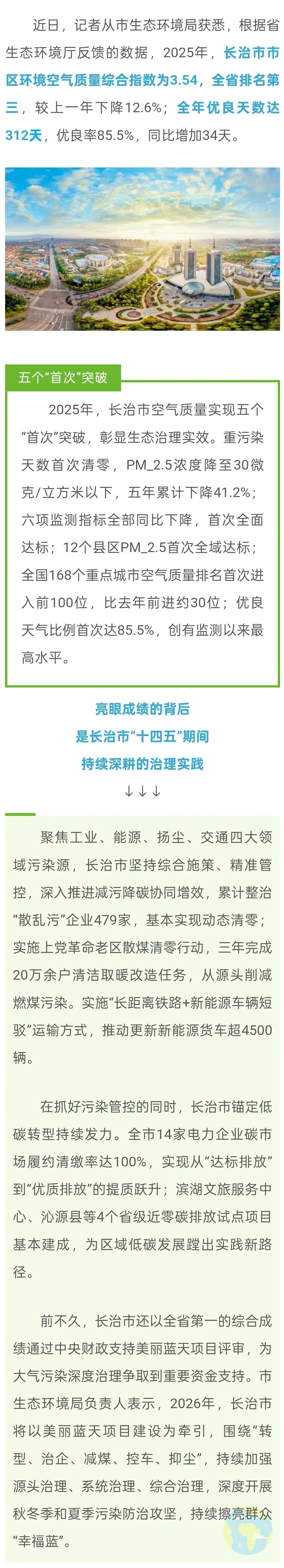 2025年长治市区空气质量创五个“首次”突破,综合指数居全省第三
