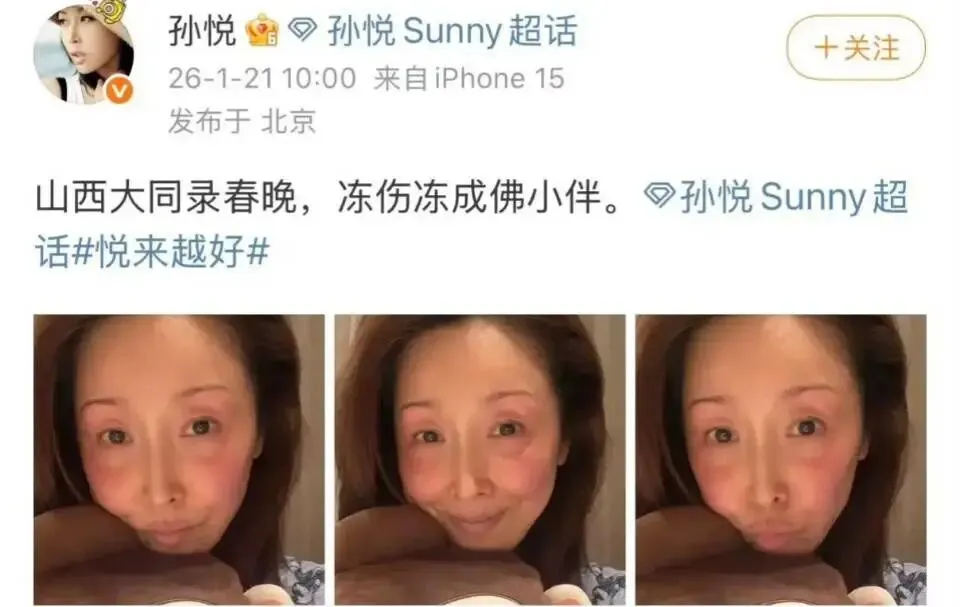 挺喜欢孙悦的,听着她的歌长大的。这位出生在东北的老姐姐发文,分享自己在山西大同录制春晚,因为天气严寒,不小心把脸冻伤,冻成了佛小伴。