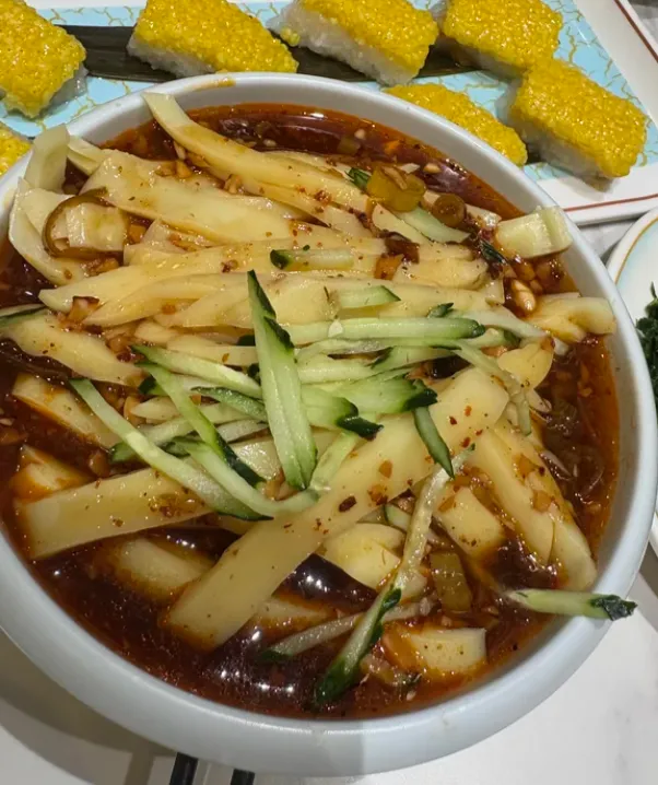 特别推荐尝尝“碗托”。这东西看着像凉粉,但比凉粉劲道。它是用荞麦面糊糊做的,先在碗里蒸熟,晾凉了切成条。吃的时候,一定要浇上特制的醋汁和辣椒油。筷子一搅,酸辣味儿直冲鼻腔,入口凉飕飕、滑溜溜的,嚼起来又带着荞麦的香气,一碗下肚,暑气全消。