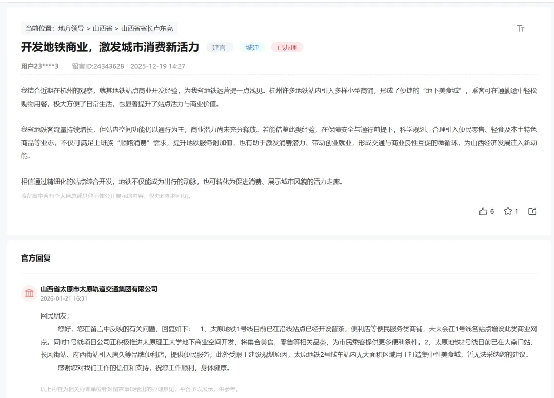 您好,您在留言中反映的有关问题,回复如下: 1、太原地铁1号线目前已在沿线站点已经开设晋茶,便利店等便民服务类商铺,未来会在1号线各站点增设此类商业网点。同时1号线项目公司正积极推进太原理工大学地下商业空间开发,将集合美食,零售等相关品类,为市民乘客提供更多便利条件。2、太原地铁2号线目前已在大南门站、长风街站、府西街站引入唐久等品牌便利店,提供便民服务;此外受限于建设规划原因,太原地铁2号线车站内无大面积区域用于打造集中性美食城,暂无法采纳您的建议。