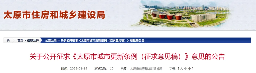 1月19日,太原市住建局发布了关于公开征求《太原市城市更新条例(征求意见稿)》意见的公告。