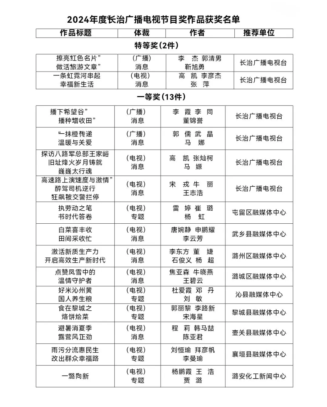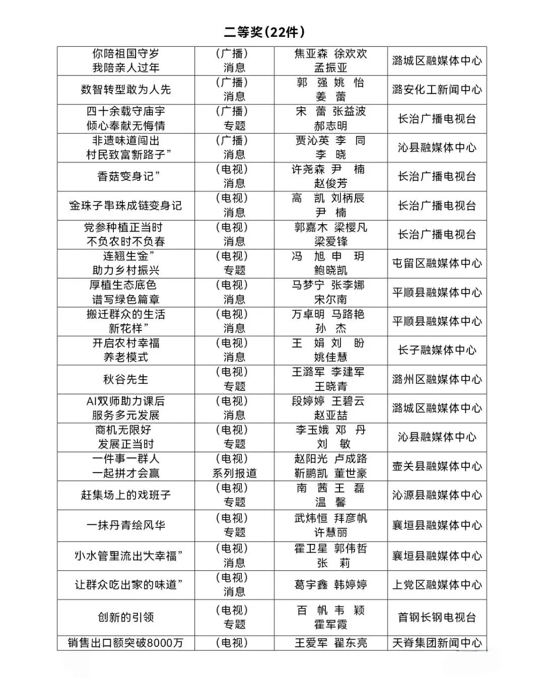 由长治市广播电视协会承办的“长治广播电视节目奖”评选结果已揭晓。本次终评共有80件作品获奖,其中新闻类(广播电视)特等奖各1件,广播节目12件,电视节目66件。现将评选结果予以公布: