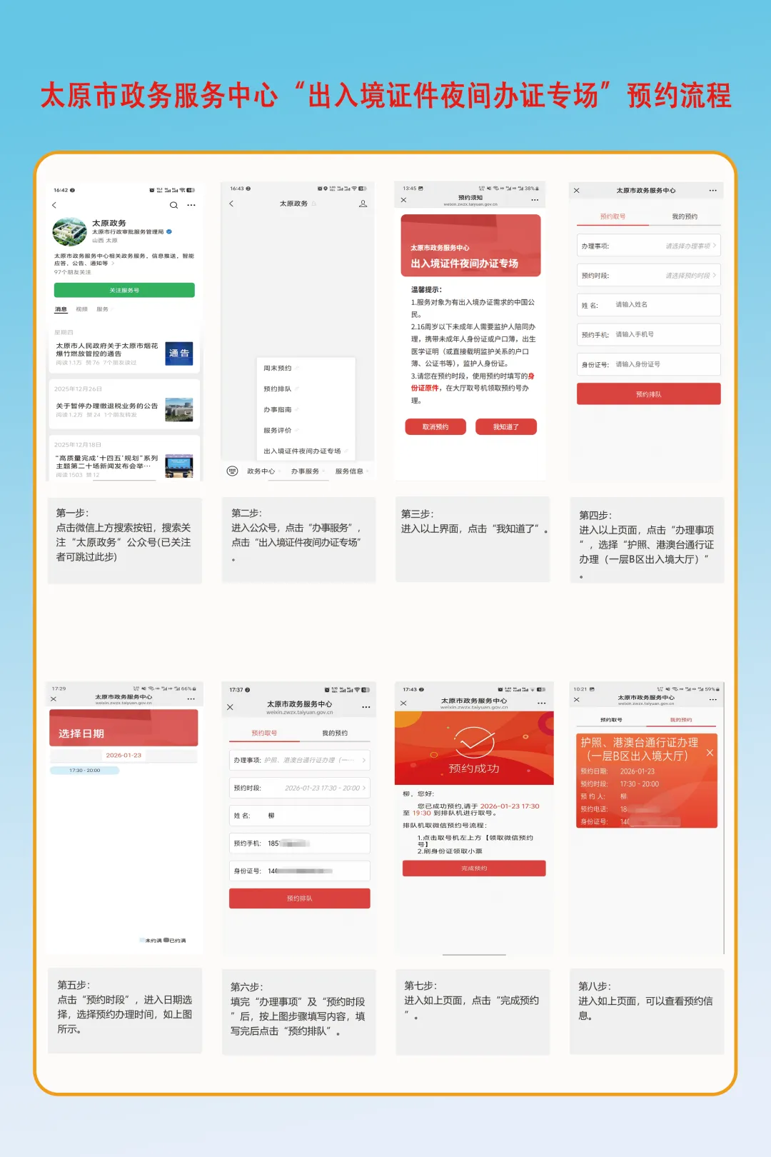 有出入境办证需求的中国公民,可提前预约夜间办证服务,微信搜索“太原政务”微信公众号,关注后在下方点击“办事服务”选择“出入境夜间办证专场”模块,在线预约成功后前往大厅排号办理。