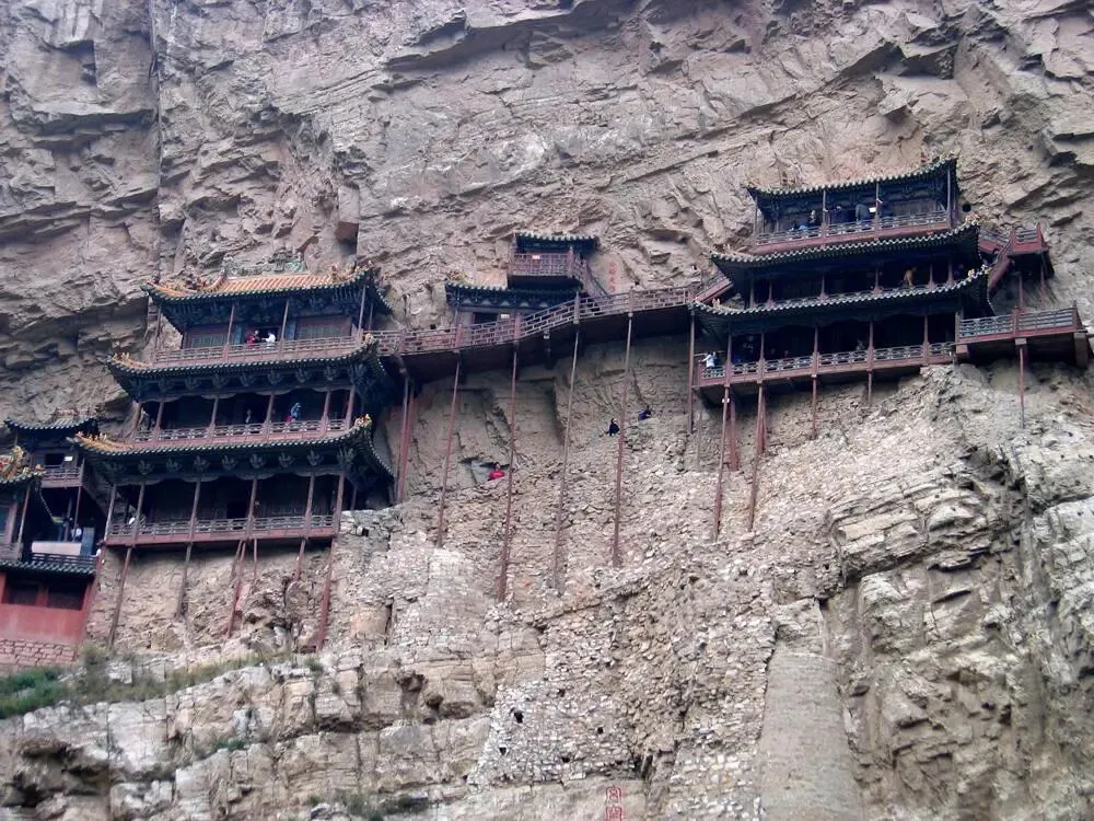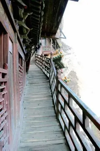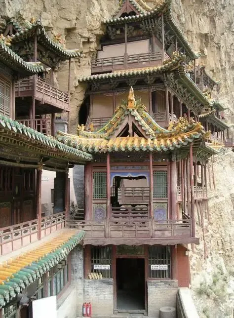悬空寺,原名“玄空寺”,位于山西省大同市浑源县恒山主峰西侧翠屏峰悬崖间,始建于北魏太和十五年(491年),距今已有一千五百多年。是中国罕见的儒释道三教合一寺庙。寺内建筑以木质框架结构为主,最高点距地面90米,采用半插横梁和岩石暗托稳定。寺内有三宫殿、三圣殿等,供奉儒释道三教创始人像。