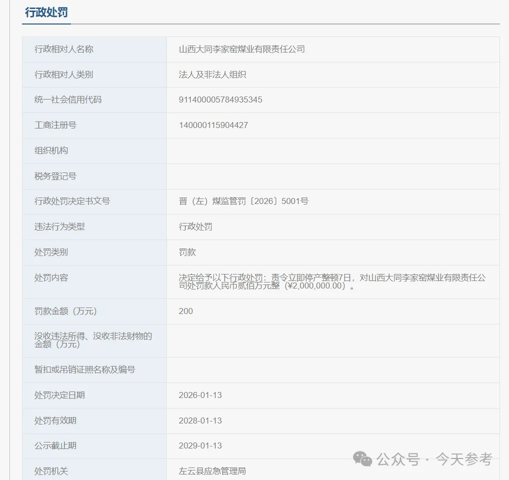 2026年1月13日,山西大同李家窑煤业有限责任公司超能力生产的重大事故隐患被行政处罚200万元。