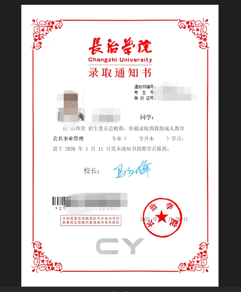 长治学院录取通知书