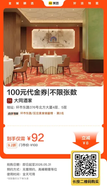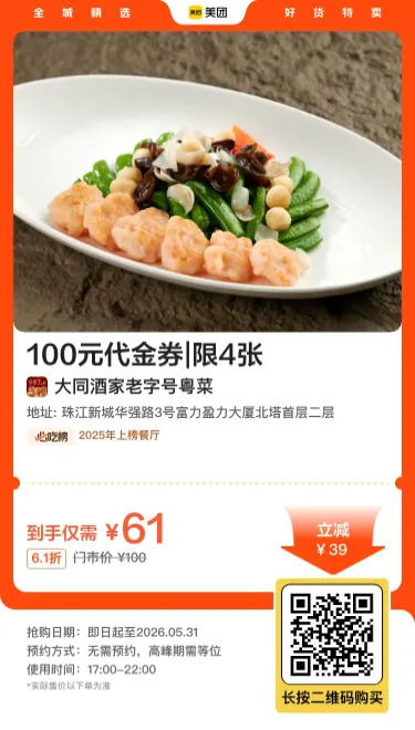 >【广州】大同酒家『61抵100代金券』3 店可用
