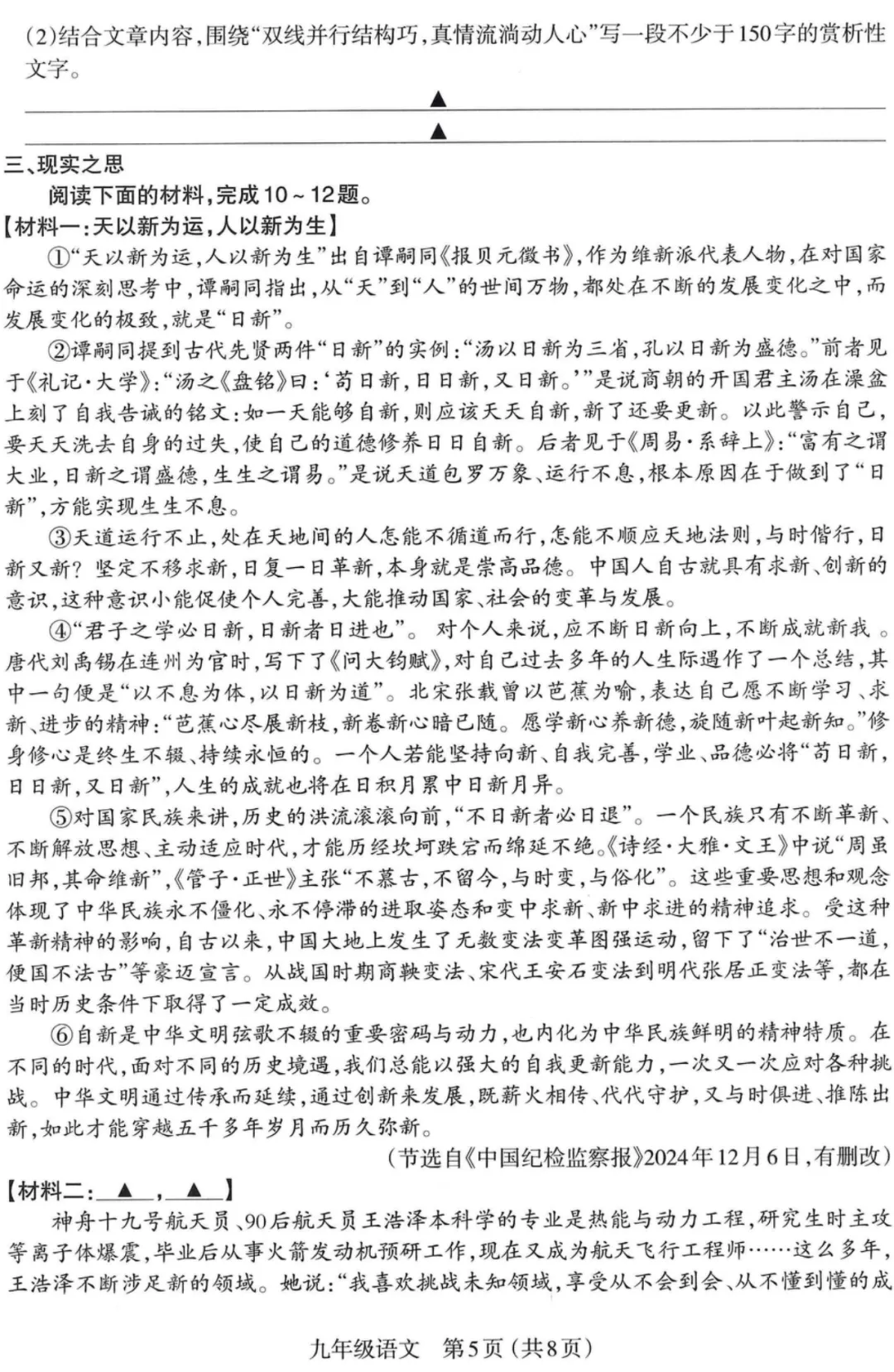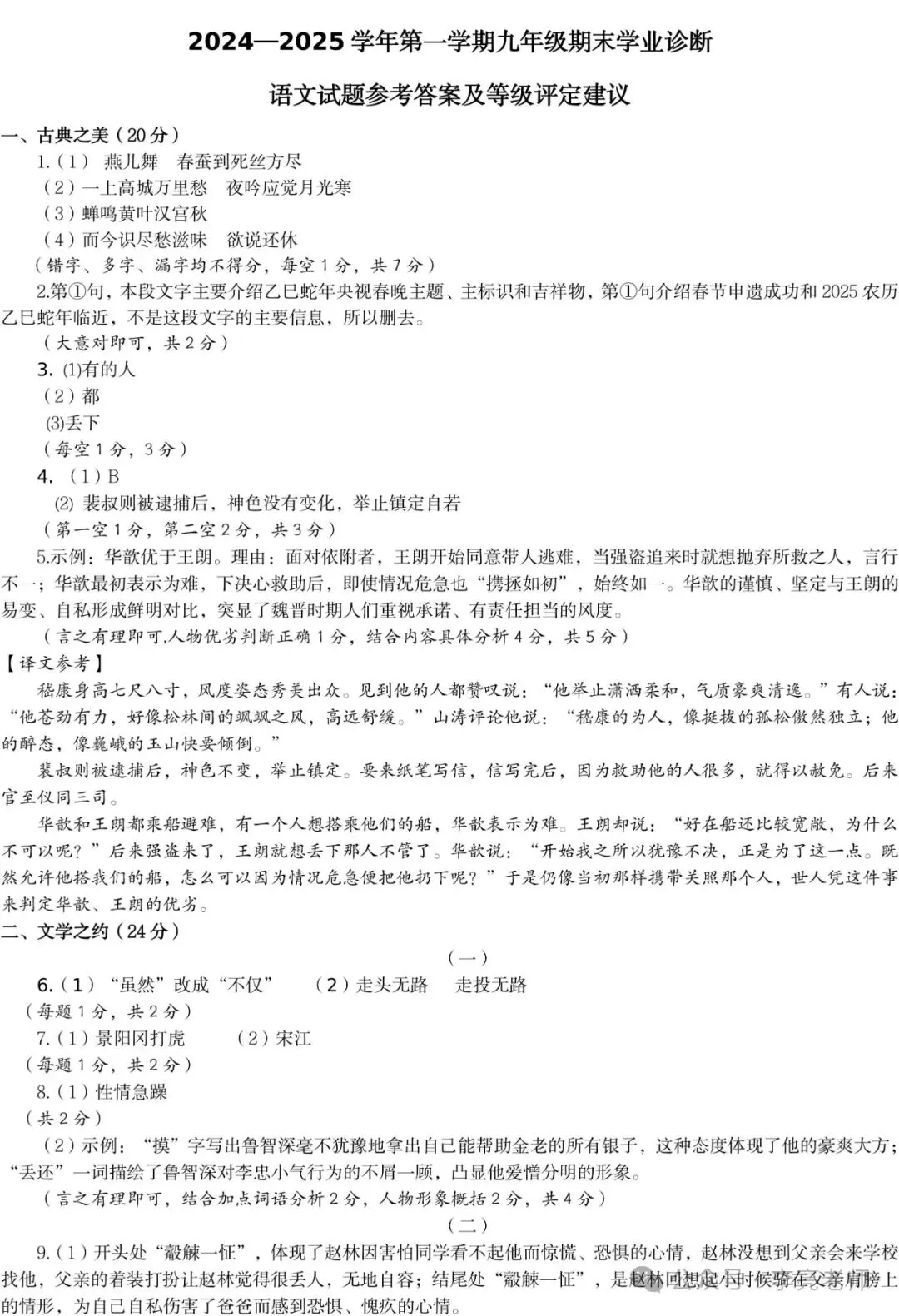>太原市 九年级 2024-2025 第一学期 期末【语文】试卷+答案