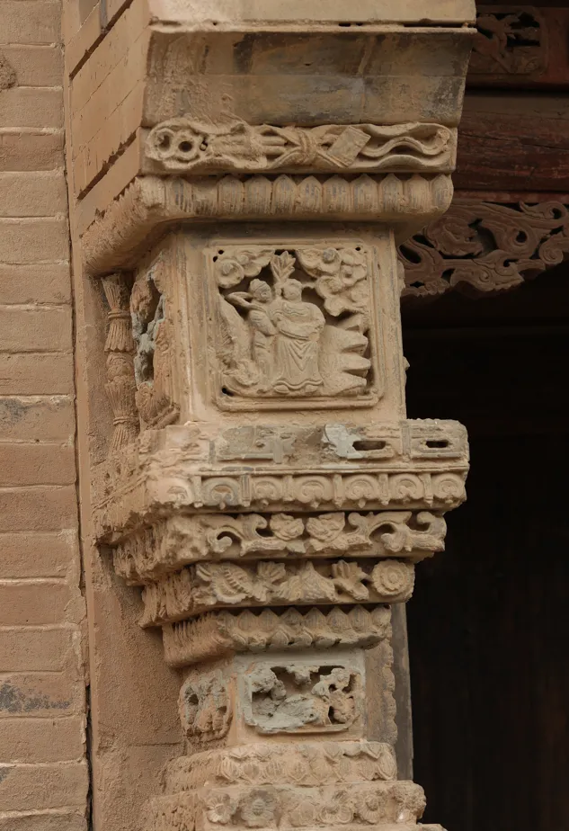 门楼东西两侧为厚实的黄褐色土墙,尤其东侧墙体棱角分明,十分齐整。门楼砌砖有修补痕迹,门洞上的砖雕图案精巧。门楣上额匾阴刻“保障”二字。