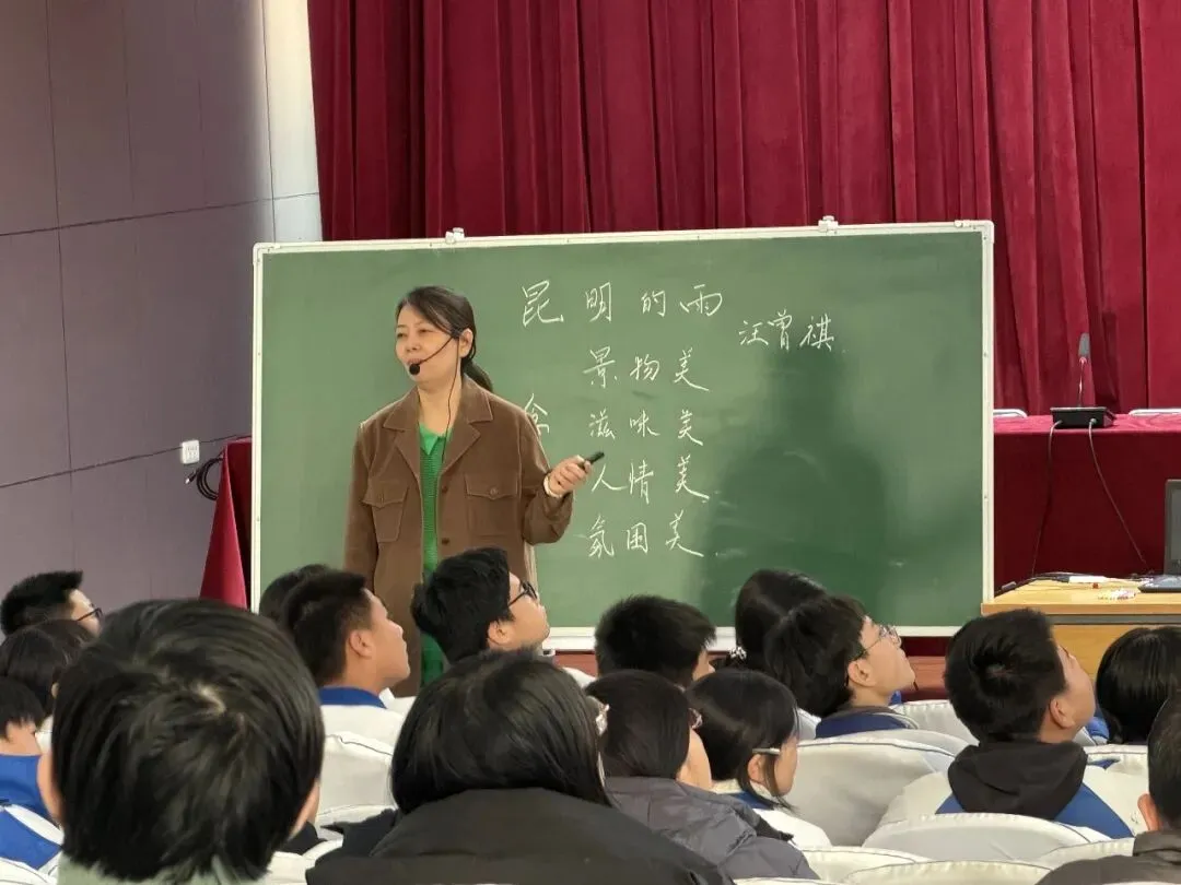 吴蔚渤老师的授课课题为《昆明的雨》。旨在引导学生深入品味汪曾祺散文平淡隽永、寓深情于日常的语言风格。教学设计聚焦于文本细读与能力迁移,通过多层次的朗读指导,引领学生品析文中蕴含的滋味美、景物美、人情美与氛围美,在语言中触摸作者对昆明雨季的深沉眷恋。