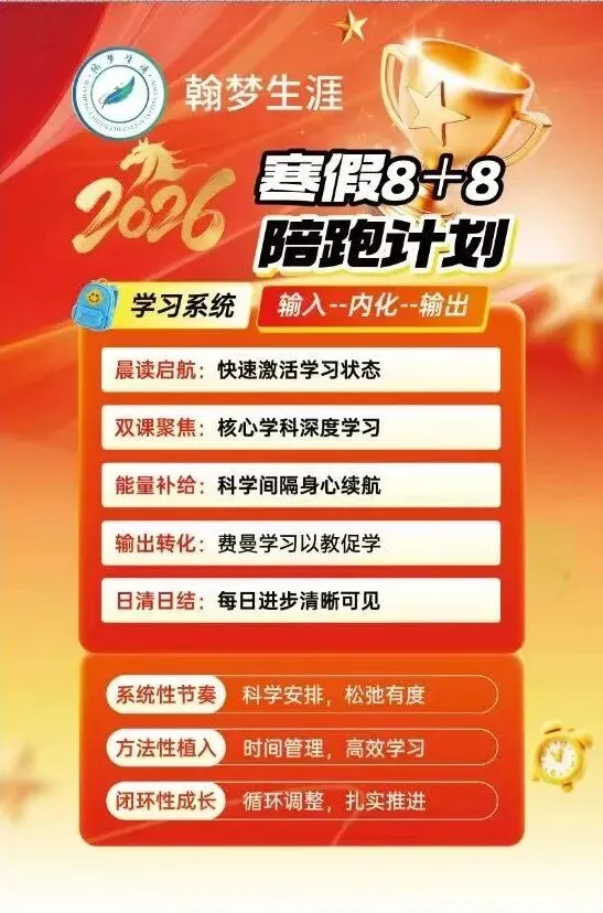 为此,翰梦生涯专属定制「8+8双阶段陪跑计划」,以科学节奏拆解目标,用专业陪伴落地执行,真正帮孩子实现“年前补弱固基,年后预习抢跑”,带着底气开启新学期。