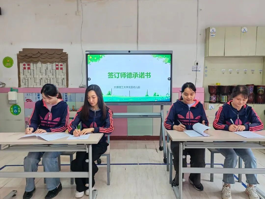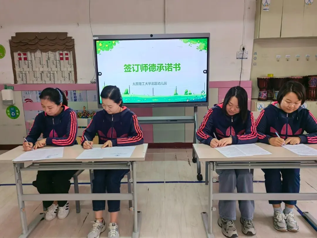全体教师郑重地在《师德师风承诺书》上签下自己的名字。承诺书从坚定政治方向、关心爱护幼儿、规范保教行为、拒绝有偿服务、严守廉洁纪律等多个方面对教师行为作出明确要求,进一步明确了教师的责任与义务,强化了教师的自我约束意识。