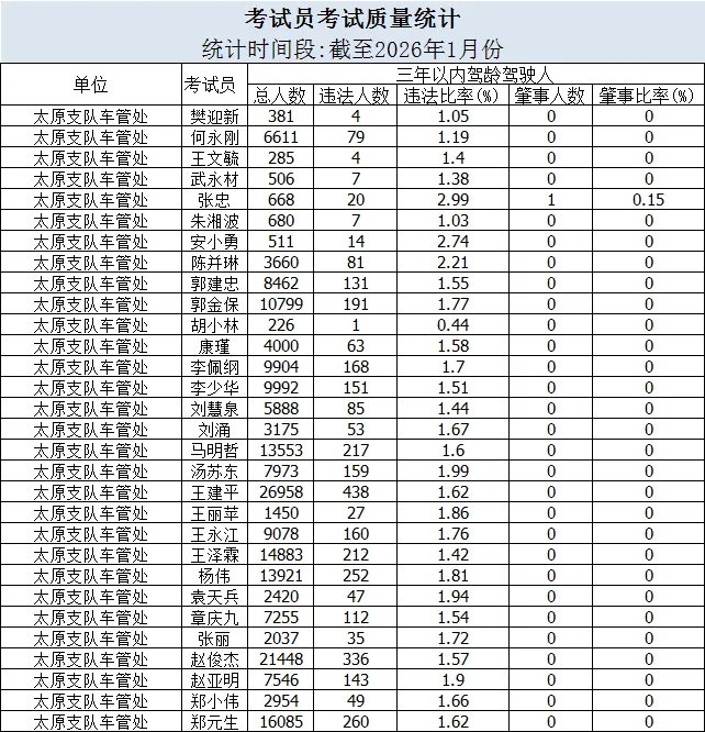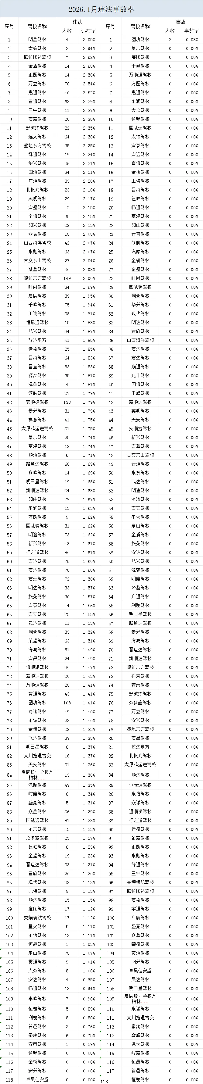 根据公安部交管局工作要求,现向社会公布辖区机动车驾驶人培训学校培训合格率、考试员考试质量、违法事故率等情况。