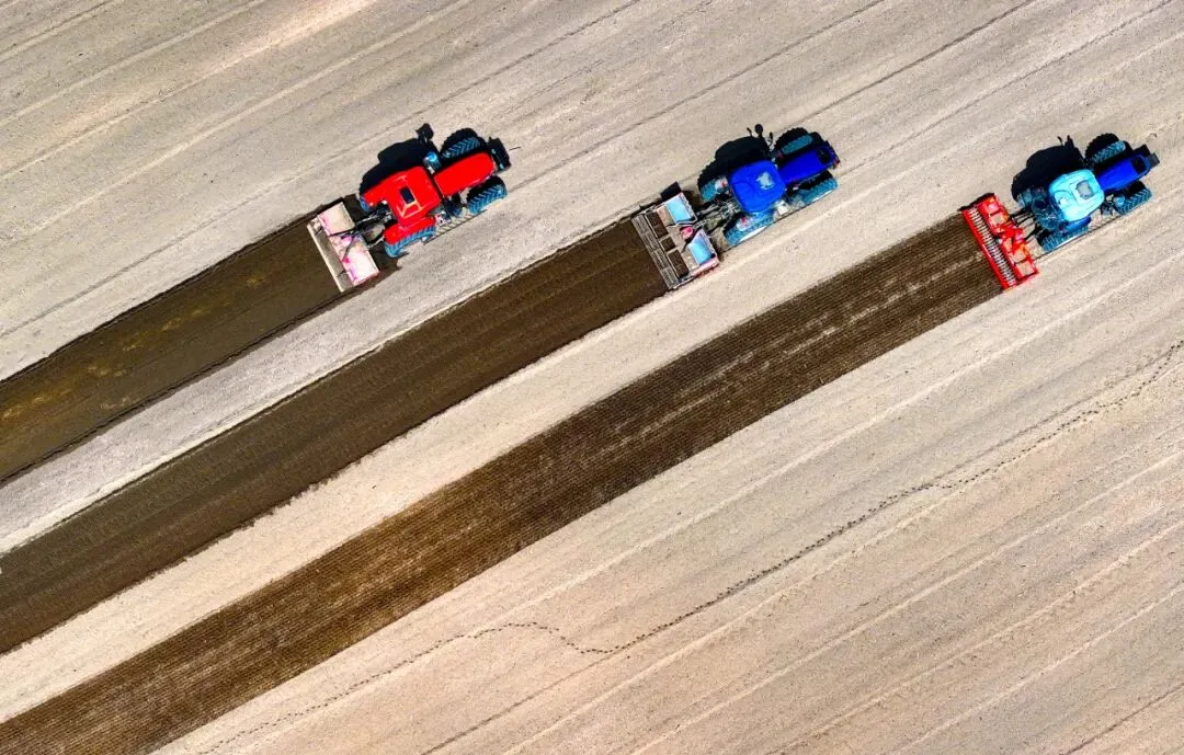 ▲ 大同市雨泽农业科技有限公司与中国移动相关团队合作,在平城区西谷庄村东落地“北斗+智慧农业”试点项目,通过智能指挥系统、物联网监测及农机监管等技术,实现北斗导航无人播种作业,构建数字化种植场景。张占兵摄(资料照片)