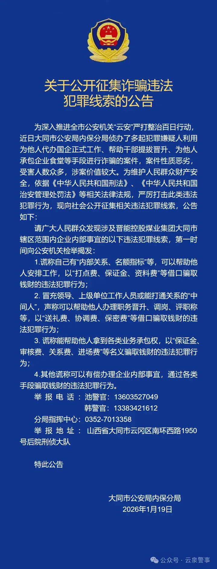 >征集线索!大同公安重要公告