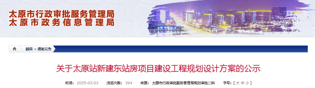 3月3日,太原市行政审批服务管理局公示了关于太原站新建东站房项目建设工程规划设计方案。