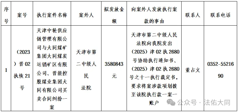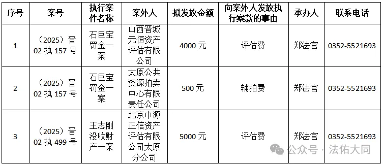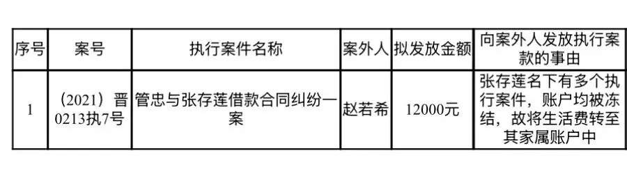 为进一步规范执行案款收发、管理,依法维护当事人的合法权益,防范廉政风险,确保执行案款发放规范有序、及时高效。依据《最高人民法院关于执行款物管理工作的规范》《最高人民法院关于进一步规范执行案款管理工作有效防范风险隐患的通知》的要求,现对下列执行案款发放事宜予以公示,公示期为3天,公示期间案款当事人或其他利害关系人主张权利的,应提交书面意见并附证据材料,交本院审查处理。公示期满无异议或异议被驳回,本院将按照执行款管理规定办理发放手续。