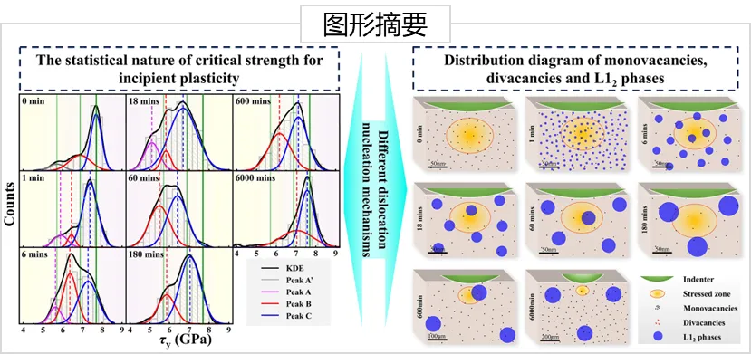 文章速读:本文通过纳米压痕系统研究了L12 析出相尺寸演化对 (CoCrNi)94Al3Ti3 中熵合金起始塑性行为的影响,首次揭示了相干界面可显著降低位错形核临界应力,并导致起始屈服强度呈现多模态分布的本质机制